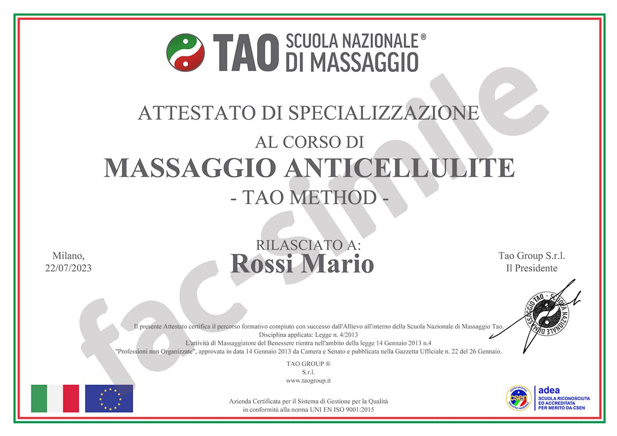 Al termine del corso di Massaggio Anticellulite verrà rilasciato un Attestato di Specializzazione valido su tutto il territorio nazionale.