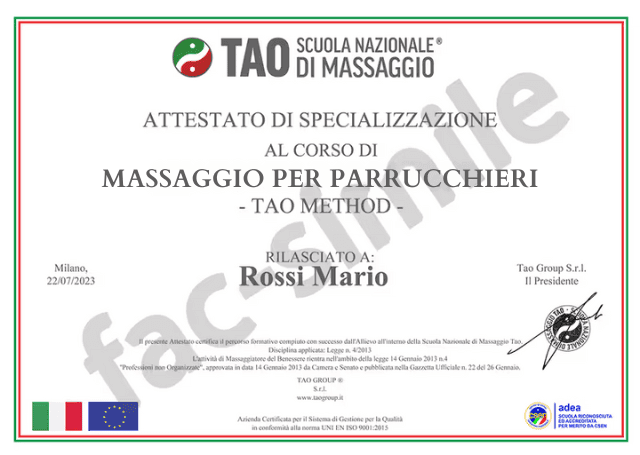 Al termine del corso di massaggio per parrucchieri verrà rilasciato un Attestato di Specializzazione valido su tutto il territorio nazionale.